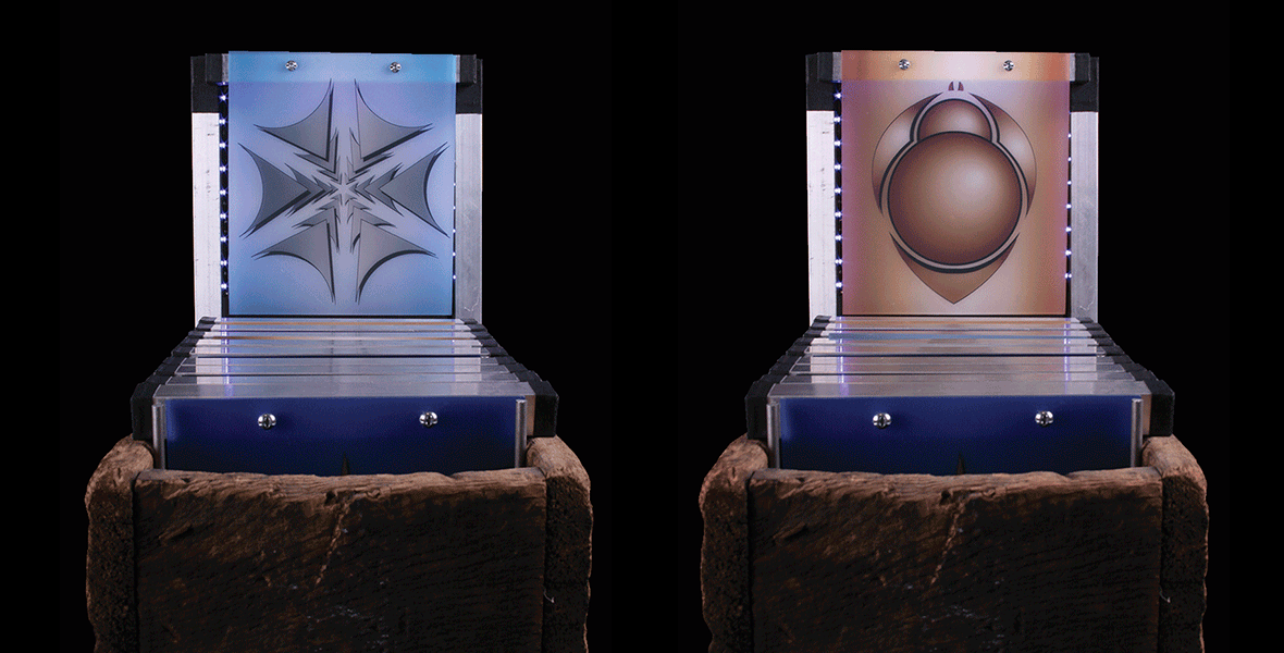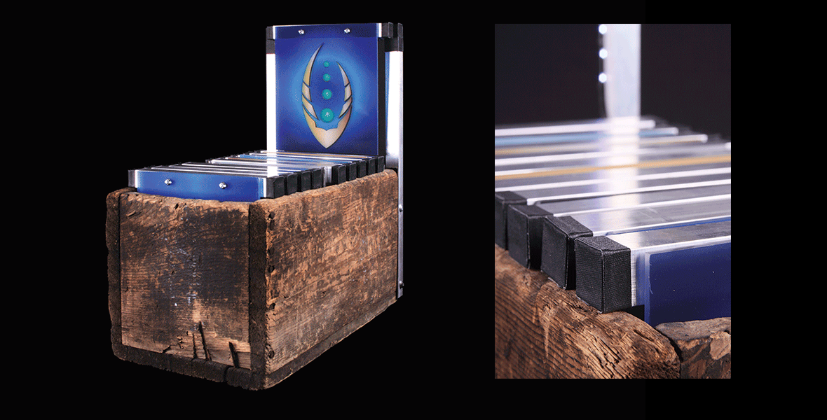 Six Memos: Is an acquired old wooden box that integrates square aluminum framing, acrylic plates, LED lighting and magnets. These materials are both organic and man-made; a sharp contrast to each other.