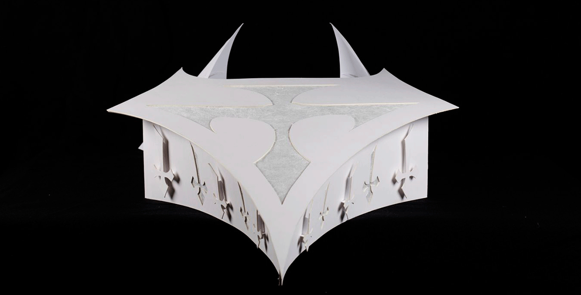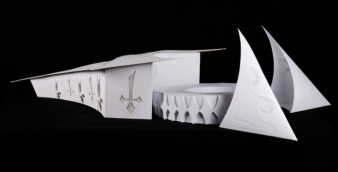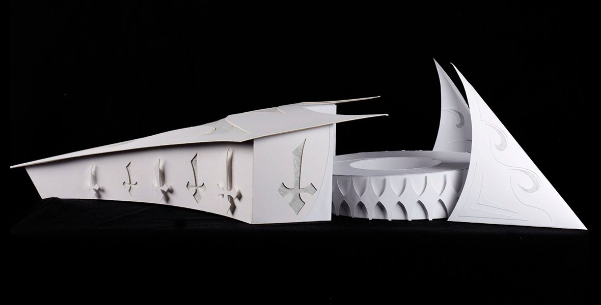 Paper Architecture: A Three-Dimensional design made entirely out of paper. It appears architecturally “solid” yet has fine, ethereal details. Inspired by deconstructing an October guitar called the Annihilator.