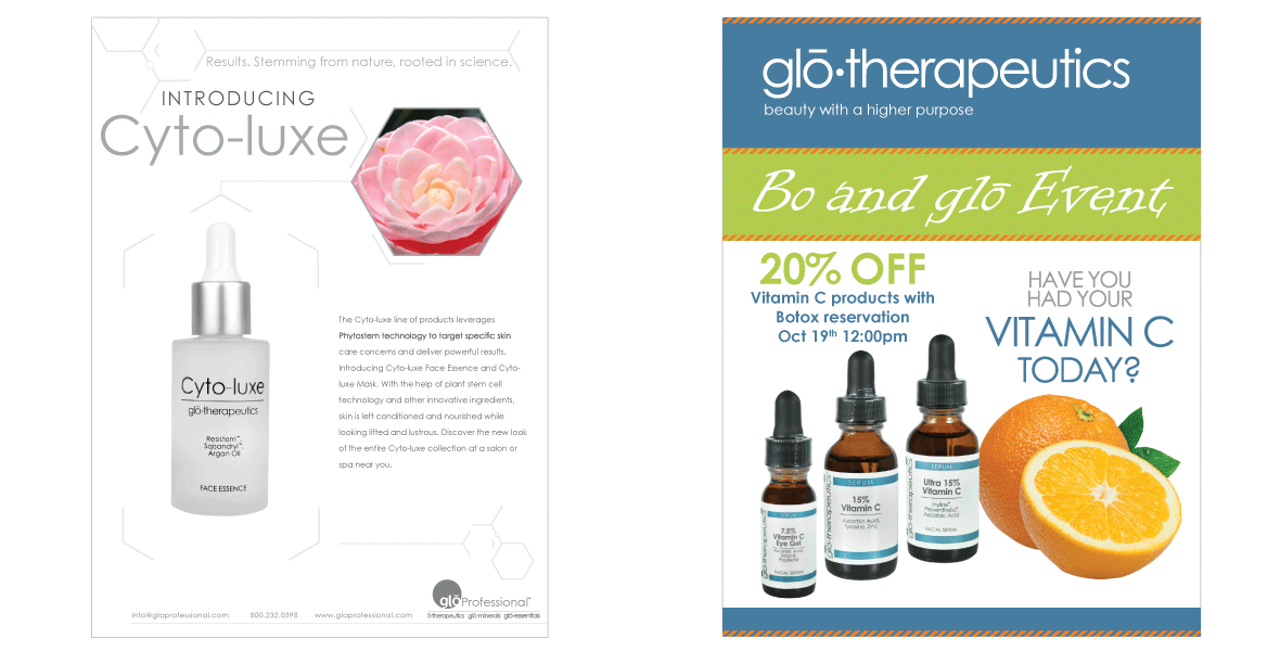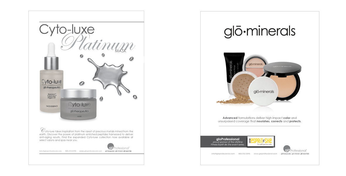 gloProfessional was a fast-paced environment that required me to work on several projects at one time and constantly make adjustments to shifting priorities and timelines. A typical day required shifting between numerous projects such as a product placement ad, creating packaging for a new product, fulfilling purchase orders in need of revised die lines, then airbrushing new makeup looks for a new hire presentation. I used all of my artistic skills in this position, including my proficiency in color theory, artistic abilities to create custom designs from sketches, studio photography of all product shots, basic web advertisements and pre-press production.